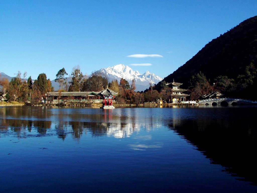 黑龍?zhí)豆珗@位于昆明北郊的龍泉山五老峰下,(亦稱龍泉山麓,太極山、五老山), 昆明黑龍?zhí)墩嫉孛娣e91.4公頃,距離市區(qū)約17公里。這里古木參天,泉壑幽邃,修竹茂林,潭深水碧,景色幽深。民間傳說有黑龍王潛藏于此,故稱黑龍?zhí)兑喾Q龍泉山麓,距離市區(qū)約17公里。黑龍?zhí)秲?nèi)有罕見的大型梅園,是昆明的賞梅勝地,稱為“龍泉探梅”。園內(nèi)的“唐梅”相傳由南詔移植過來,同安寧漕溪寺的“元梅”被認(rèn)為是云南最珍貴的古梅。在黑龍?zhí)秲?nèi)還有這樣的奇怪現(xiàn)象,潭以中間的石橋?yàn)榻缫环譃槎磺逡粷幔鍧嶂ゲ幌嗳冢瑩?jù)說連魚兒都互不過界,頗為神奇。黑龍?zhí)妒怯忻牡澜虅俚兀譃樯舷聝捎^,從漢代的黑水祠演變而來。上觀始建于唐宋時(shí)期,始稱龍泉觀,下觀始建于明代,俗稱黑水宮。1997年,黑龍?zhí)队斡[區(qū)占地3.6公頃。1999年,黑龍?zhí)队酗L(fēng)景林51.4公頃,植有各種喬灌木12萬(wàn)多株。梅園28.5公頃,地栽梅5794株,盆栽梅1725盆。庭園占地6.9公頃,有喬木3973株,灌木48660株,修竹306叢。 1978年建苗圃,占地5.6公頃。建有杜鵑谷,植各種杜鵑10萬(wàn)多株。1998年又新辟一期綠化工程,占地33公頃,游覽區(qū)擴(kuò)大到45.4公頃。園內(nèi)有昆明市綠化委員會(huì)掛牌保護(hù)的古樹名木18株,是昆明市存有古樹名木最多的風(fēng)景名勝區(qū)。麗江黑龍?zhí)妒冀ㄓ谇《辏?737),其后乾隆六十年、光緒十八年均有重修記載。舊名玉泉龍王廟,因獲清嘉慶、光緒兩朝皇帝敕封“龍神”而得名,后改稱黑龍?zhí)丁T?shī)云:“泉渙渙兮漣漪,問何時(shí)最是可人?須領(lǐng)略月到天心,風(fēng)來水面;亭標(biāo)標(biāo)而矗立,看這般無(wú)窮深致,應(yīng)記取云飛畫棟,雨卷珠簾。”黑龍?zhí)兑云涮焐愘|(zhì),名列《中國(guó)名泉》、《中國(guó)風(fēng)景名勝》等書,誠(chéng)不虛也。迎面見有一座涂金繪彩的牌樓,門口四尊石獅,肌理秀美,威武雄壯,過去守護(hù)木氏土司衙門,1966年遷此守護(hù)玉泉。進(jìn)門往右,但見垂柳飄指,一潭澄碧,樹底天光云影,樹梢樓臺(tái)隱現(xiàn)。沿潭右堤至鎖翠橋,橋上古人有聯(lián)云:“驚濤撼樹飛晴雪,未雨垂虹臥曲波。”它生動(dòng)地描繪了橋邊景致。右邊橋下三孔飛瀑,水花四濺,上觀景區(qū)濤聲如雷,流向古城,玉水河畔,楊柳依依,濃蔭蔽日。往橋的左邊看,一座五孔石拱橋,長(zhǎng)虹臥波一般,將潭一分為二,玲瓏俊美的一文亭、得月樓分別屹立內(nèi)外潭心,四面臨水,有橋與岸上相連。此樓始建于清光緒二年(1876年),樓名取自古人對(duì)聯(lián)“近水樓臺(tái)先得月、向陽(yáng)花木早逢春”中三字。1963年重建時(shí),郭沫若為該樓題寫了匾額“得月樓”三字及兩[1]副對(duì)聯(lián)。一副是集毛澤東詩(shī)詞句:春風(fēng)楊柳萬(wàn)千條,風(fēng)景這邊獨(dú)好;飛起玉龍三百萬(wàn),江山如此多嬌。另一副是郭老撰書的楹聯(lián):龍?zhí)兜褂呈澹瑵擙堅(jiān)谔欤w龍?jiān)诘兀挥袼v橫半里許,墨玉為體,蒼玉為神。全聯(lián)僅三十字,卻寫出了麗江黑龍?zhí)兜纳耥崳瑫ㄥ賱哦鵀⒚摫挤牛瑸楣珗@增色不少。遠(yuǎn)處玉龍雪山倒遇潭中,可見“雪山四萬(wàn)八千丈,銀屏一角深插底”奇景。象山半壁也映入水中,使黑龍?zhí)渡街杏兴杏猩剑剿嘤常吧珶o(wú)比秀麗。