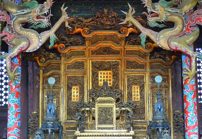 崇政殿:又稱“金鑾殿”,通稱“正殿”,是皇太極處理政務、接見使臣的場所,清代歷朝皇帝東巡祭祖時也在此聽朝理政。面闊五間,綠剪邊黃琉璃瓦,單檐硬山頂,前后有出廊,圍以石護欄。殿內為徹上明造,和璽彩繪,寶座后有貼金龍扇屏風,旁為貼金蟠龍柱。殿外庭院左右有飛龍閣、翔鳳閣、東七間樓和西七間樓。
