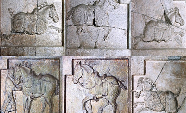 在祭壇東西兩廡房內(nèi)置有6匹石刻駿馬浮雕像,馳名中外,曾有詩云:“秦王鐵騎取天下,六駿功高畫亦優(yōu)。”這是李世民自己選定的題材。他在隋亡以后,為統(tǒng)一割據(jù)的局面,鞏固唐王朝新建的政權(quán),南征北戰(zhàn),馳騁疆場,他騎過的六匹馬,聯(lián)系他的戰(zhàn)叻。據(jù)說當(dāng)時擔(dān)任營山陵使、工部尚書、著名工藝家、美術(shù)家閻立德起圖樣,由筑陵石工中的高手雕鐫而成的。這六具石雕駿馬是在平面上起圖樣,雕刻人馬形狀的半面及細部,并使高肉突起,稱之浮雕,也叫“高肉雕”。每邊三具,皆背靠后檐墻而立。據(jù)記載,原石在每塊上角有歐陽詢書太宗自撰的馬贊詩,隨后另有殷仲容隸書刻于座上,這些今俱不可見,原詩收入《全唐文》中。六駿的名為“特勒驃”、“青騅”、“什伐赤'、“颯露紫”、“拳毛馬咼”、“白蹄烏”。現(xiàn)存西安市碑林博物館,其中“颯露紫”、“拳毛馬咼”二駿,于1914年被盜運美國賓夕法尼亞大學(xué)博物館。昭陵六駿刻于貞觀十年,各高2.5米,橫寬3米,皆為青石浮雕,姿態(tài)神情各異,線條簡潔有力,威武雄壯,造型栩栩如生,顯示了我國唐代雕刻藝術(shù)的成就。在“颯露紫”中表現(xiàn)了唐太宗在與王世充作戰(zhàn)時為流矢所中,丘行恭進前為他拔箭那種親切形象。昭陵的這些石刻在品類、造型及題材上,既不取生前儀衛(wèi)之形,也不用祥瑞、辟邪之意,獨具一格,所有石刻都是寫實,富有政治意義的不同凡響之作。