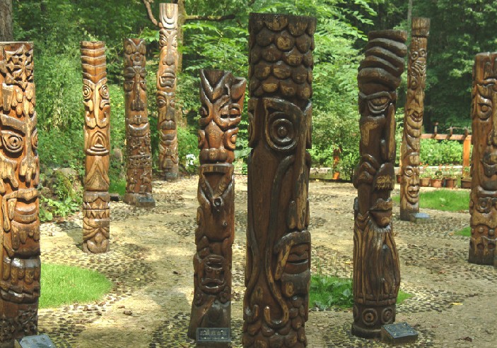 薩滿圖騰林,一共有 15 根圖騰柱,上面雕刻的神像形態各不相同,因為薩滿教是原始的多神教, 是在“萬物有靈”的觀念支配下所形成的一種多神崇拜。 滿族人信仰的神靈很多,但是薩滿教沒有廟宇和神祠,也沒有專職的掌教和祭主等神職人員。信奉此教的人們,在族人中自發形成一位“察瑪”,主管每次祭祀天地、山神、土地和祭祖、許愿等重大活動。 神靈,則多用木雕或繪畫的形式體現。