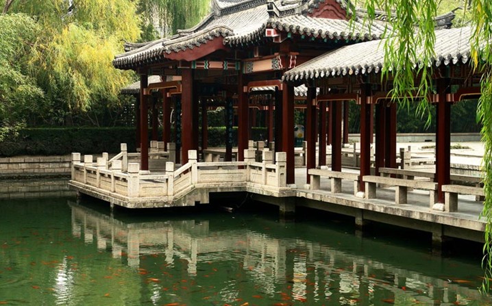 五龍潭,位于濟南舊城西門外,洛源橋北,南臨趵突泉,北接大明湖。潭周名泉眾多,形成五龍潭泉群,為濟南四大泉群之一,內有泉池二十七處。公園的建園風格兼具有南北造園之精華,是以潭池溪港等景觀構成,質樸野逸為特點的園林水景園。此水域風景秀麗,柳絲醮波,鳴禽啾啾,荇藻漂浮,錦魚嬉戲,素有“夾岸桃花,恍若仙境”之美譽,風景幽雅獨具特色。