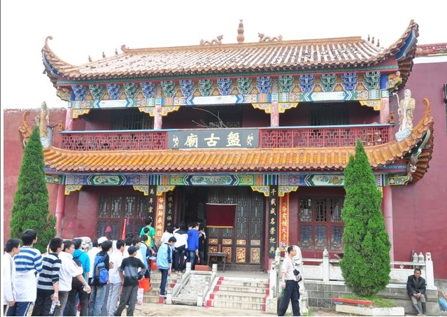 地處河北省滄州市北的青縣城南6公里有村曰“大盤古”,村西有座盤古廟。盤古廟始建于元世祖至元十五年(1278年),明弘治和崇禎年間曾重修,清康熙二十七年(1688年)因河流沖刷,設于秋祠西南重建,均有碑記。據文獻記載和民間傳說,當年的盤古廟狀似北京的故宮三殿,石、磚、木結構,琉璃瓦蓋頂,金碧輝煌,蔚為壯觀。前殿高三丈六尺,象征一年360天;臺階18級,為18層地獄之說;飛檐椽子108根,按36天罡、72地煞而布;每根椽頭系銅鈴一枚,照工、商、角、征、羽五音而置,有所謂“風搖鈴響天動樂,光照殿頂地生輝”之說。殿內有身披樹葉,手托日月的鐵鑄涂金盤古像,高一丈零八寸。中殿塑有南海觀音像,股坐蓮盆,金童玉女立兩側。版權所有山東聊城聊之旅國際旅行社有限公司,轉載必究!后殿設老君、孔子、龍王三塑像,殿前有合抱粗的合歡樹兩株,殿后鐵磬懸于古槐。可惜盤古廟在1947年毀于戰火。九十年代,當地群眾組織起來修復盤古勝跡,以滿足來此朝圣拜祖的人流尋訪。