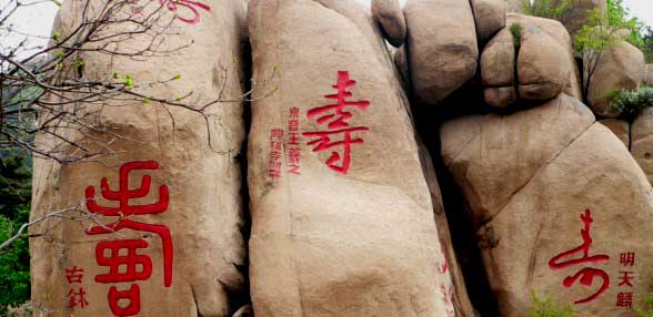 從山名可以看出,此地的風(fēng)景與“壽”有關(guān),的確,景區(qū)內(nèi)都以雕刻、建筑、書(shū)法等多種形式反映出長(zhǎng)壽延年的主題,尤其是景區(qū)中部壽山上的壽字碑林,大大小小形態(tài)各異的石塊上刻著歷代書(shū)法家所寫(xiě)的“壽”字,字體不同,風(fēng)格迥異,其中不乏書(shū)法大家的珍品,如王羲之、顏真卿、歐陽(yáng)詢(xún)、米芾、蘇東坡等都在這里留下了墨寶,這一處碑林也就成了書(shū)法愛(ài)好者向往之地。置身其中,既可受到民族文化藝術(shù)的熏陶,還可領(lǐng)略獨(dú)特的山情水趣。