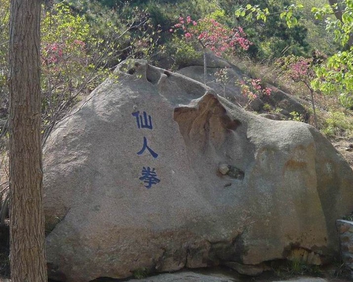 從石門澗逆溪水往山上走,過(guò)鰲魚(yú)石、剪子峰,來(lái)到麻衣山前,這里有麻衣庵的殘?jiān)?jù)民國(guó)年間的《增修膠志》記載,晉代的陳仲舉、元代的張清源、明代的趙麻衣等名士曾在這里隱居過(guò)。庵后的峭壁上,有一懸空石室,室門鑿造得很精致,門高兩米,頂為孤形,有石門框和石雕門檻。在離石室前約3米處有刻有蓮花圖的蓮花石。《增修膠志》記載,在石室與蓮花石之間古有鐵板橋連接,人可攀蓮花石過(guò)鐵板橋進(jìn)石室。石室東側(cè)的山壁上刻有“云逍庵”三字。石壁上還有李慶道等人署名的“玉泉觀旨緣”石刻,又有元代大德四年(1301年)孫榮題寫的“太清巖”刻字。庵東側(cè)有 “飛來(lái)石”,石前額刻“朝陽(yáng)洞”三字。庵前有“說(shuō)法石”,在說(shuō)法石下,有一石碾底,透出過(guò)去這里的人間煙火氣息。庵西側(cè)的高處有一平臺(tái),條石砌的建筑基礎(chǔ)很規(guī)整,站在這里可以東望靈山灣,西望龍灣,這是“望海樓”的故址。