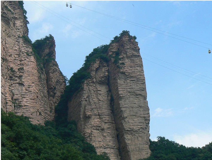 如果誰(shuí)要是不知“層巒疊嶂”這個(gè)詞的確切含義,就到嶂石巖去讀吧。它的山巒成三疊,每一疊都如紅色屏 嶂石巖風(fēng),高一二百丈,廣數(shù)里,石壁光滑如磨,纖草不生,飛鳥(niǎo)難落,猿猴難攀。每?jī)莎B間錯(cuò)落成平臺(tái),樹(shù)茂草豐,呈綠色環(huán)帶。