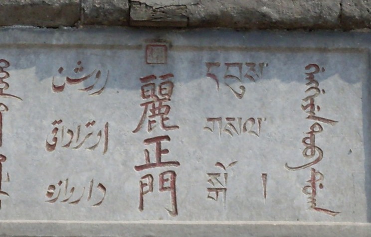 麗正,取自《易經》:“日月麗于天”,意思為光明正大的門。因我國的封建皇帝恍都詡為受命于天的天子,故名其正門為麗正門。在我國歷史上,元朝大都北京皇城的正門曾叫麗正門,明代改稱正陽門。清帝乾隆將避暑山莊兼正宮的正門命名為麗正門,表明這里是同皇城一樣重要的政治活動場所。麗正門前正中央門洞上方,鑲有乾隆用漢、滿、蒙、維、藏五種文字題寫的“麗正門”石質匾額,這是我國統一多民族國家的體象征。中門北面的門額上刻有乾隆皇帝于乾隆十九年寫的一首詩:
