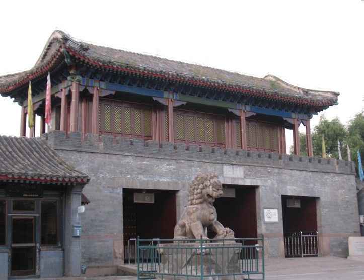 門前列石獅和下馬碑,迎面有紅照壁,門上有閣樓,下有3門,高敞宏偉。中門上方有乾隆題額“麗正門”三字,取《易經》“日月麗乎于天”之意,用漢、滿、蒙、藏、維五種文字刻成。它和門內上方乾隆題詩“兩字新題標麗正,車書恒此會遐方”,象征著國內各民族團結,國家強盛、統一。