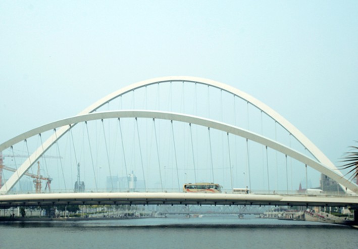 向西行到四緯路和六經路交口處,一組更為恢宏的美景,映入人們眼簾。這組美景,是大型浮雕彩燈水景--“百龍戲水”。它地處海河風景線中段,主段是一座長107米、寬4米的白色大理石浮雕,鐫刻著近百條神態各異、翻騰奔躍的白龍,構成4個“游龍戲水”的逼真畫面。兩側的漢白玉石上,一邊刻著“百龍戲水,時泰景和”,一邊刻著“津門龍影,萬象更新。”每一條龍的嘴部,含有一個噴頭,海河水從龍嘴中噴涌而出,在音樂程序的控制下,不斷變幻著水柱的高度和形狀。浮雕的前面,裝有造霧噴頭和300盞水下彩燈。入夜,龍嘴中的水柱,造霧噴頭的水霧,交匯在一起,浮雕前仿佛進入“云海茫茫”的境界,水上彩燈又將白龍、水柱、水霧映得五光十色,堪稱天津一大奇景。