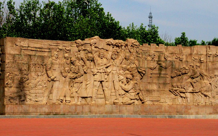 大廳正中央的鑄銅雕像《走向勝利》,表現(xiàn)了中共中央毛澤東和劉少奇、朱德、周恩來、任弼時五位書記的領袖風采;墻屏上毛澤東主席關于平津戰(zhàn)役作戰(zhàn)方針的浮雕手跡熠熠生輝;環(huán)周巨幅壁畫《勝利交響詩》反映了東北、華北兩大區(qū)軍民英勇奮戰(zhàn)、奪取戰(zhàn)役勝利的宏大場面。