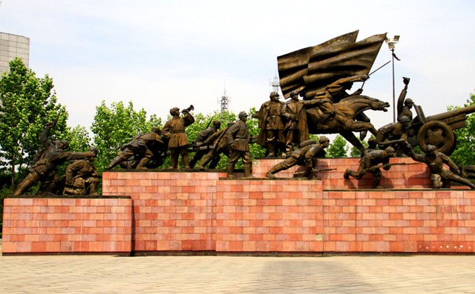 紀念廣場總體環(huán)境藝術以勝利為主旋律。兩根高大花崗巖圓柱構成勝利門,柱頂分別佇立著人民解放軍東北野戰(zhàn)軍和華北軍區(qū)部隊戰(zhàn)士雕像。兩壁反映軍民團結奮戰(zhàn)、歡慶勝利的花崗巖浮雕墻分列勝利門兩旁。廣場中央豎立著高64米的勝利紀念碑,不銹鋼三冷刺刀直插云霄。廣場東西兩側的大型鍛銅群雕,烘托出人民戰(zhàn)爭的磅礴氣勢。