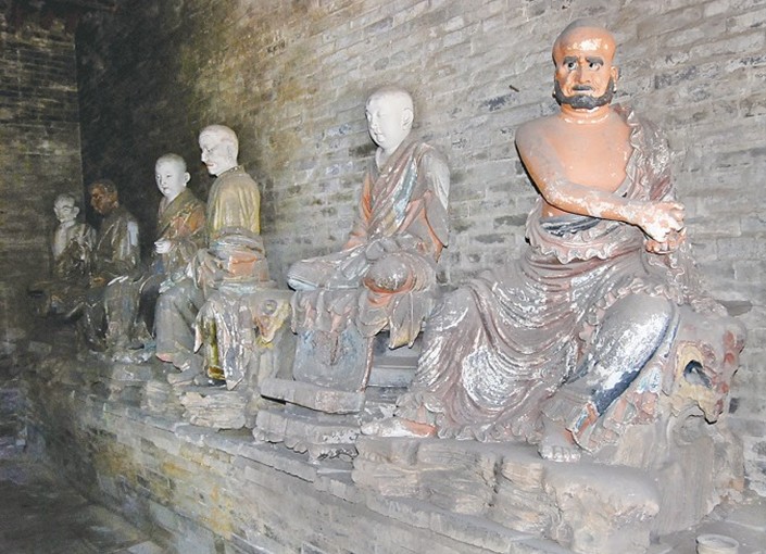 與一般漢地佛寺相同的是,大殿內共塑有十八羅漢,其分布是東、西兩側各九位羅漢。羅漢全稱為阿羅漢,他們是佛的得道弟子,是小乘佛教修行所獲的最高果位(據說修到了羅漢的境地,就已經斷盡三界煩惱,永遠解脫輪回之苦)。
