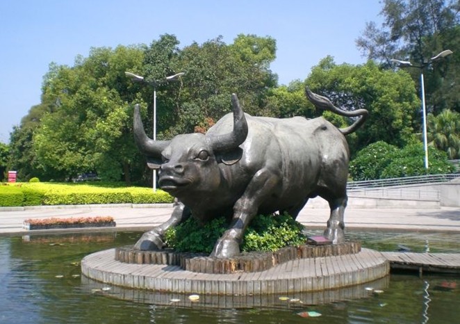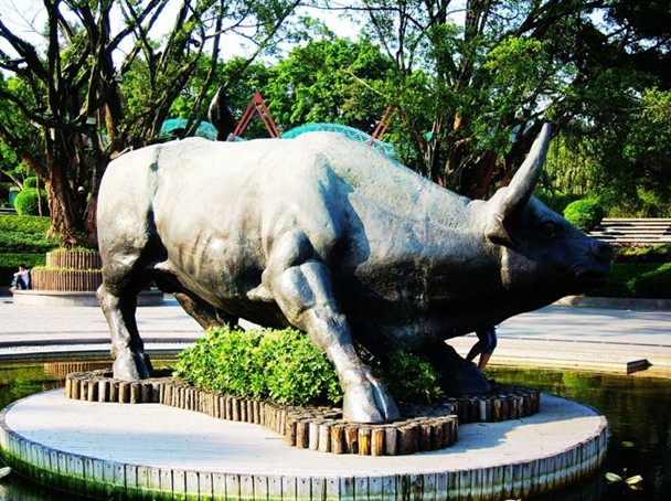 金牛山海拔163米,疊水廣場(chǎng)因泉水層層相疊流動(dòng)而得名,廣場(chǎng)的占地面積為5400平方米,另外還有1200平方米的專用停車場(chǎng),在疊水廣場(chǎng)正中央擺放的是金牛雕塑。這尊健碩有力、憨態(tài)可掬的金牛雕塑是中央美院陳科副教授特意為公園精心雕刻而成,體高8.8米,長(zhǎng)6米,重6噸,整尊雕刻由精銅注雕而成。