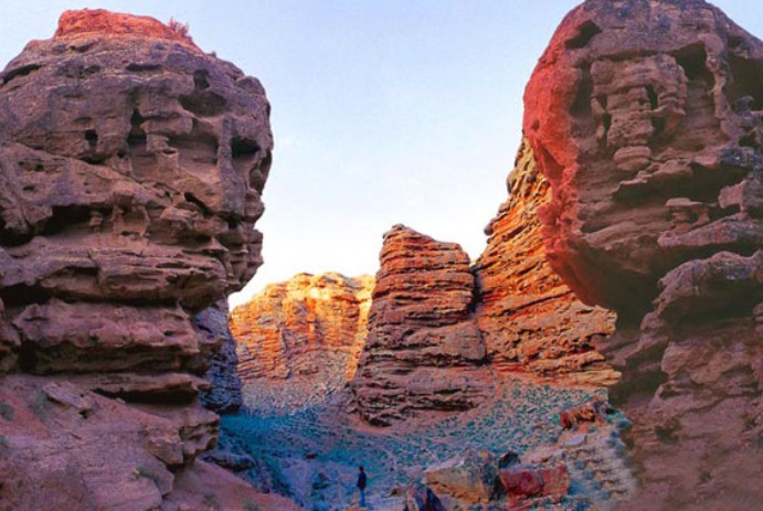 進(jìn)入峽谷漸行漸遠(yuǎn),眼前景致的獨(dú)特讓人感到無比驚訝,只有發(fā)自內(nèi)心地贊嘆大自然的鬼斧神工,不由地想起兩句古詩:遠(yuǎn)看成嶺側(cè)成峰,遠(yuǎn)近高低各不同。同一座山峰,從不同角度看、從不同的人眼中看,風(fēng)景都不一樣,甚至有藝術(shù)靈感的人可以運(yùn)用抽象思維,讓面前的山峰變幻成更多畫面,而自己的思想就像野馬馳騁在寬闊的原野上,在抽象世界冥想,沉浸其中無法自拔。