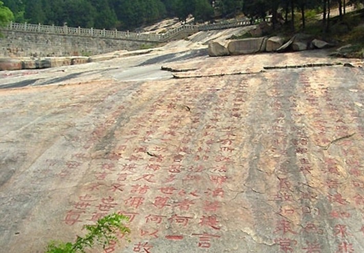 經石峪金剛經刻位于斗母宮東北經石峪,是中國現存規模最大的佛經摩崖刻石。 經文刻于面積2064平方米的緩坡石坪上,自東而西刻《金剛般若波羅密經》,采用后秦鳩摩羅什譯本,原本全1卷、32分目、5172字,經刻只刻到15分目“特經功德 兮”,計44行,每行125字或10字不等,凡2799字,字徑50厘米。經刻歷千余年風 雨剝蝕、山洪沖擊、游人踐踏、捶拓無度,已殘泐磨滅過半,現僅存經文41行、 1069字(包括可認讀的殘字和雙勾字)。