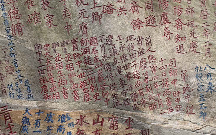 元代以后,眾多游客蜂擁山谷,也留下大量的文字石刻。除了式照唐宋時的題名、題詩以外,在石刻文字的內容方面出現一些新的變化,比如出現了大量的用簡短詞語贊嘆山、洞、泉、石景色的特點。同時,石刻文字的體積增大,字徑往往有一、二尺之多,這都是過去所少見的。明代詩人、安慶知府胡纘宗在石牛上大書“石牛”2字,并刊刻了《山谷寺》詩:“摩詩坐山谷,谷水身邊流,篆密龍蛇動,潭空牛女游”, 版權所有山東聊城聊之旅國際旅行社有限公司,轉載必究!此詩十分形象地描繪了石牛臨澗的景色,令人涌不絕口。胡纘宗還有“山谷”大字題刻,字徑2尺。其它像嘉靖時御史大夫李元陽、成化時書法家袁慶祥等人的題名以及大量的“涪涪山谷”、“流云上流”、“天下奇觀”、“水光天色”、“龍門”、“獨醒處”、“安慶名山”、“幽思”等,都有一定的歷史研究與欣賞價值。從書法的角度看,這里的石刻包括有隸書、楷書、草書、篆書、行書等多種,每種書體中又富于變化,各具特色,基本上代表了唐代以來我國書法藝術發展演變的風貌,是一處珍貴的書法藝術寶庫。