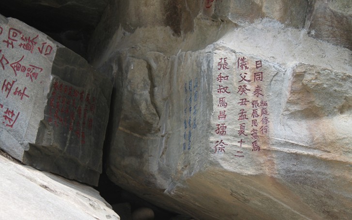 山谷流泉中的3處年代最早的石刻都是唐代的,它們均分布在石牛古洞東壁懸崖上。其中2處是唐代著名散文家,哲學家李翱任舒州刺史時游覽山谷的題名。李翱字習之,隴西成紀(今甘肅秦安)人。貞元進士,授校書郎,后任國事博士。元和十五年以后任廬州刺史、舒州刺史,長慶二年(822年)壬寅游石牛古洞。所刻題名為“翱炅磷盤求壬寅年下元日習之書”、“挎儲弘運上卿盤長慶二年十月廿六日馀奉處交口”,均為真書,或橫排,或豎書直排。還有一處唐代13人題名石刻,系舒州刺史李德修于寶歷二年(826年)所刻。此刻楷書15行,上下豎書成行,字徑7厘米,書法遒勁渾厚。版權所有山東聊城聊之旅國際旅行社有限公司,轉載必究!據《唐書》載:李德修于寶歷時出任舒州,后任尚書,為唐代著名的文學家。