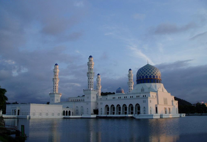 哥達京那巴魯市立清真寺座落在里卡士灣畔(Likas Bay),是一座典型的當代伊斯蘭教建筑,是馬來西亞夕陽景觀最壯麗的清真寺之一。它建于里卡士灣的人造湖上,感覺有如浮在水面之上,因而得到“水上清真寺”的美稱。令人驚嘆的白色建筑物造型,與藍天完美的連成一體。清真寺于1997年建成,占地一公頃,可容納最多12,000名教徒祈禱。