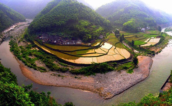 九井之六,九井中最長者,直下近40米,九井河一路皆急流喧嘩,轟鳴聲不斷,到梁公泉下,突然開朗,有近1平方公里良田、農舍呈現眼前,回首藍天白云,青山綠水,雞犬相聞,山歌對應,簡直懷疑在桃花源中。