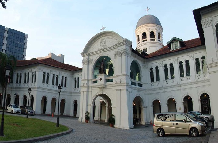 新加坡美術館坐落在新加坡最早的天主教學校圣約瑟書院舊址,這組保留完整的古希臘修道院式建筑,在新加坡十分罕見,中央建筑有兩個特征,一是成為勿拉士巴沙路象征的“三公仔”銀色塑像(中間的塑像就是基督教會學校修士學院的發(fā)起人圣約翰),二是它的銀色圓形頂樓,圓頂上還有一個十字架。