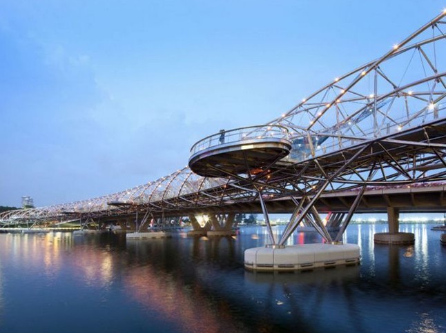 新加坡雙螺旋橋,位于新加坡濱海灣,長280米、寬6米的人行橋。新加坡雙螺旋橋是世界上首座雙螺旋人行橋。業主單位是新加坡市區重建局(URA)和 陸路交通管理局(LTA)。于2010年4月24日建成通行。新加坡雙螺旋橋于2007年3月底動工建造。設計人員受DNA結構的啟發,這座橋梁想要體現的意義是“生命與延續、更新與成長”。