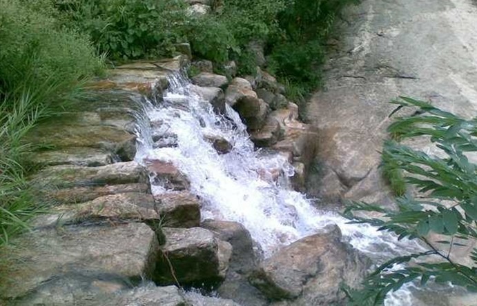一股清泉從石縫涌出,涌上突兀的巖石,沿巨石涌入水潭。涓涓細流,或聚或散,有時如一片珠簾,隨風飄灑,水簾在陽光映射下,時明時暗,耀著彩虹,下有一水潭,水面達2000平方米,山翠水清,石奇潭垂,一年四季皆有美景。