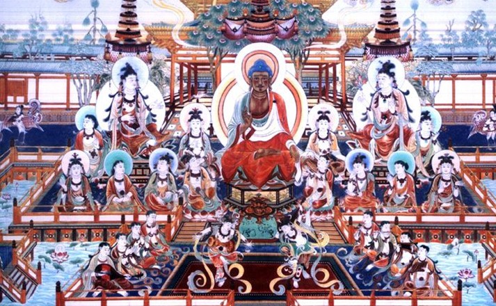 7窟前室東西壁南側繪兩幅《接引佛》。正中兩幅各4.5平方米的《說法圖》十分復雜,天上畫日月、翼人,靈山雷音寺中佛祖高坐蓮臺說法,左右兩側長廊下站立眾弟子,兩排使樂、天人奏樂,樂器有長蕭、排蕭、長笛、古箏、胡琴、銅磐、鐃鈸、云鑼、手鼓、大鼓等,是研究民族樂器發展歷史的重要資料。佛蓮臺前八德池中蓮花盛開,小樓內僧人手扶橫木在撞鐘。人物栩栩如生,多達84身。圖中的大雄寶殿、亭臺樓閣結構復雜,雄偉壯觀,是研究西夏民族建筑藝術風格的珍貴資料。