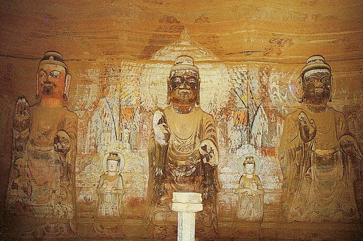 令人贊嘆的是那些高大的佛像。165窟內正壁和左右壁雕鑿八米高的七尊立佛。這七尊佛像面相方圓,嘴唇厚重,兩耳垂肩,體魄雄健,帶著北方少數民族氣質特徵。而在前壁兩邊雕鑿有五.八米高的兩身交腳菩薩;同時佛與佛之間還雕鑿有四米高的脅侍菩薩十身;窟門內南北兩側雕鑿有三.○五米高的乘象菩薩和三.一米高的三頭四臂阿修羅天造像,所有的造像無不表現出北魏時期的北方少數民族特色。