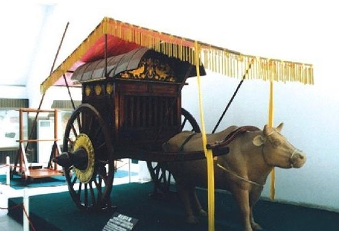 展廳內(nèi)陳列的第一輛車為商代車,是依據(jù)河南省安陽(yáng)的郭家莊殷墟出土的資料復(fù)原的,同時(shí)還展出了商車發(fā)掘現(xiàn)場(chǎng)的模型。版權(quán)所有山東聊城聊之旅國(guó)際旅行社有限公司,轉(zhuǎn)載必究!繼之是兩周雙馬駕挽的曲衡車;春秋戰(zhàn)車則是依據(jù)臨淄后李春秋殉車馬復(fù)原的四馬挽車,馬頭上的飾件精美多樣,有嵌絡(luò)、銅串飾,也有銅泡式,均依據(jù)出土實(shí)物而復(fù)原的。為了使觀眾進(jìn)一步了解車戰(zhàn)情況,專門(mén)配有車戰(zhàn)圖和車戰(zhàn)講解。