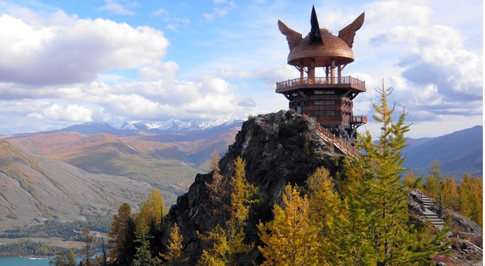 觀魚亭建于海拔2030米的哈拉開特(蒙古語意為駱駝峰)山頂上,與湖面的垂直落差達600多米,因處于觀察“湖怪”的最佳位置,故得名觀魚亭。去觀魚亭有兩條路可供選擇:一條是乘汽車從山后繞行到山腰;另一條是從湖出水口山前專為爬山者鋪設的石階盤旋步行而上。登上湖西邊山頂的“觀魚亭”,可觀看喀納斯湖的整體美景。其一可鳥瞰喀納斯湖,四分之三的湖面盡收眼底。湖面呈綢緞般光滑平靜,宛如一塊色彩斑駁的翡翠鑲嵌在山谷之間,并向下游河谷蜿蜒流淌,波光閃耀,飄散著童話般的色彩。順河水之勢望去依稀可見神仙灣、臥龍灣等河曲,草色木色水色在逆光下不斷變幻,充滿了鮮活的靈性,體現出細膩、幽雅的南國秀色般的美麗;其二可觀覽湖周層巒疊嶂、翠峰倒影、云起波濤的秀麗山色;其三舉目北望,從南向北蜿蜒而上的喀納斯湖水被群山阻擋,山巒之中可清楚地看到阿爾泰山的最高峰——友誼峰(4374米),山頂雄偉壯麗的冰雪世界,猶如一塊光潔晶瑩的白玉,聳立于群峰之巔。而 “U” 谷、古冰斗、冰磧壟等古冰川地貌遺跡,分布在喀納斯湖兩側的高山和河谷內,證明湖區曾有過多期冰川活動。