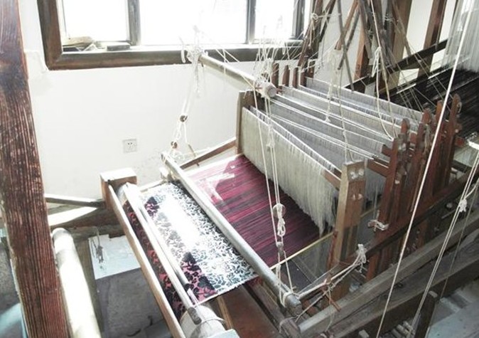 沿絲路右側,一組沙漠駝隊的浮雕,形象生動,古樸渾厚,與半墻有機結合,顯示了漢唐以來絲綢之路的風光特色。“古代館”的絲綢陳列,以其珍貴的絲綢文物及模型、圖片,展示了新石器時代晚期絲綢的起源,直到明清時期絲綢生產的沿革,它是一部濃縮了的中國古代絲綢史。絲綢離不開蠶桑,“蠶桑居”是根據近代農家養蠶載桑的真實情景和桑園再造。跨進“織造坊”,又是另一番景象,在這里可以見到各種類型的古代織機和傳統工藝的手工操作表演,猶如身臨明清時期蘇州絲綢業“東北半城,萬戶機聲”的繁榮境地??椗畟兩碇叛b作現場表演。天鵝絨織機、漳緞織機、云錦織機、腳踏繅絲機、纟革絲機,都在進行運轉操作,古代云錦、彩經絨、纟革絲等著名絲綢品種的織造過程,在這里都得到充分演示。有一種工藝獨具特色,讓人看后舍不得離開,一塊巨大的石元寶下的凹槽里,放著纏有絲織品的木棍,一位藝人將兩腳踏在石元寶下的兩個突出部,然后晃動石元寶,通過碾壓,使絲綢變得柔軟平挺。光澤可鑒。這就是江南絲織工藝一絕的絲綢砑光處理。