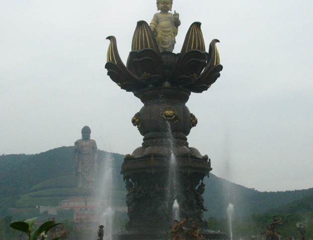 根據佛教典籍《本行經》記載:佛祖釋迦牟尼一誕生就能說話會走路,他向東南西北四個方向各走了七步,每走一步,地上就開出一朵蓮花。他一手指天,一手指地,說道:“天上天下,唯吾獨尊”,這時候花園里忽然出現了兩方池水,天空中出現九條巨龍,吐出水柱,為其沐浴凈身。這個故事十分神奇,讓人浮想聯翩。更難得的是,靈山勝境的大型音樂動態群雕“九龍灌浴,花開見佛”再現了故事中的絢麗景象。在九龍灌浴廣場,我們可以看到一座含苞待放的巨大蓮花銅雕矗立在前方,巨大的荷花由四個威武的大力士托起,底部襯托著白色的圓形大理石水池,九條飛龍和八個形態各異的供養人環繞著巨大的水池。