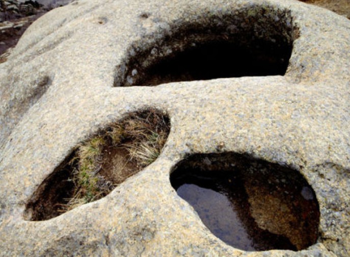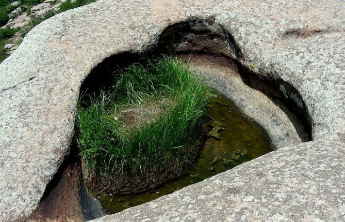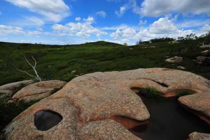 青山自然保護(hù)區(qū)位于海拔1574米的青山山體上,在山頂頂峰分布著各種各樣的冰臼,其平面上多數(shù)呈圓形、近圓形、橢圓形和不規(guī)則的形狀。有的象葫蘆,有的象梅花,有的象瓜子。一般冰臼口稍小,中下部較大,底多較平或呈鍋底微凹。形體“似臼”、“似盤”、“似盆”、“似匙”等,可以說應(yīng)有盡有。其中較深的冰臼多呈口小、肚大和底平特征。口部上緣帶有缺口(或開口),缺口有大有小,有深有淺。一般臼口寬約0.3~2米,深0.1~2米左右。最大的直徑達(dá)10.5米,深4.5米;最小的只有幾公分,似一般鈕扣大小。據(jù)調(diào)查統(tǒng)計(jì),在方圓不到2平方公里的范圍內(nèi),就有大小不一的冰臼1000多個(gè)。有的冰臼光潔如洗,無任何殘留物和充填物,但很多冰臼中,都填滿風(fēng)塵黃土物質(zhì),已長滿花、草或喬木、灌木,形成大小不同的“天然盆景”,置于堅(jiān)硬平坦的花崗巖山脊上,十分壯觀,給人極大的神奇感和奧秘感。