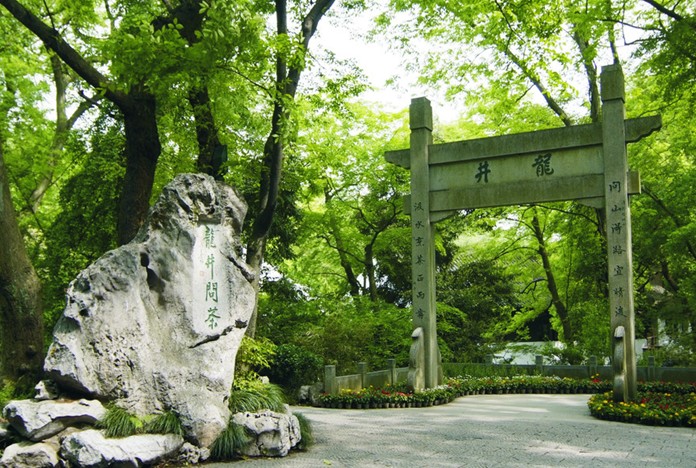 龍井位于西湖之西翁家山的西北麓,也就是現(xiàn)在的龍井村。龍井原名龍泓,是一個圓形的泉池,大旱不涸,古人以為此泉與海相通,其中有龍,因稱龍井,傳說晉代葛洪曾在此煉丹。離龍井500米左右的落暉塢有龍井寺,俗稱老龍井,創(chuàng)建于五代后漢乾祐二年(949年),初名報國看經(jīng)院。北宋時改名壽圣院。南宋時又改稱廣福院、延恩衍慶寺。明正統(tǒng)三年(1438年)才遷移至井畔,現(xiàn)寺已廢僻為茶室。周圍還有神運石、滌心沼、一片云諸勝跡。龍井之西是龍井村,環(huán)山產(chǎn)茶,名西湖龍井茶,因具有色翠、香郁、味醇、形美,贊為“四絕”而著稱于世。