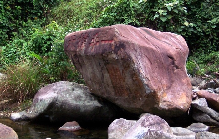 “手辟南荒” 系1887年春馮子材所題。石刻全長385X112厘米,字個約80×63厘米,正文為橫幅,楷體陰刻。分上下款,版權所有山東聊城聊之旅國際旅行社有限公司,轉載必究!上款“大清光緒十三年春”,下款“欽差大臣太子少保督辦全瓊軍務欽州馮子材志。”另行“三品銜廣西即補分省遇缺尺先前知府子相榮、華統兵平靖客黎各匪勒此并志。”(相榮、相華為馮子材的兩個兒子)。整體橫幅布局,筆法雄渾豪放、勁健有力,雕刻工整入石五分。 “辟”字表現無比的力度,“手“則體現了一種艱難,一句四言,以此折射了他親手開創黎區的壯舉和豪邁。
