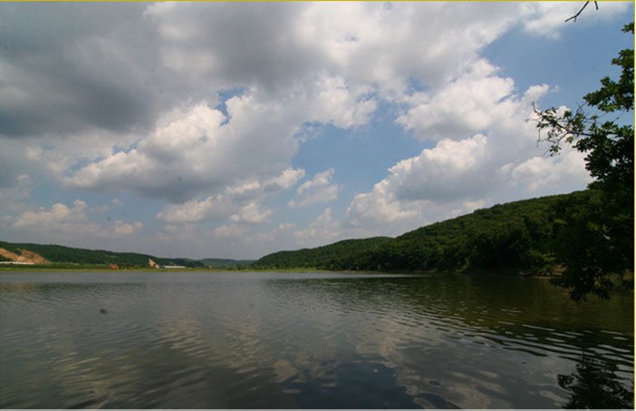 登上山頂,遠望四野:腳下杏花山松林常翠;東面的石門山,綠樹蔥蔥;北部的半拉山,石光閃爍;西邊的長達山,薄霧升騰....。一條數百米長堤橫臥南北,和攬月門聯成一線,四面青山環抱一灣碧水,一葉輕舟搖碎湖光波影,確是一個令人舒心愜意的所在。