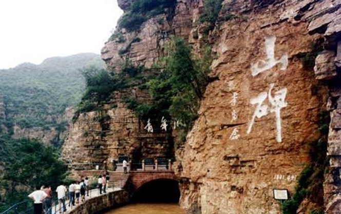 碑就是山,山就是碑。將山碑二字刻在青年洞口的山崖上,教育子孫后代永遠不忘當年修建紅旗渠,改變干旱缺水面貌的艱苦奮斗歷程,激勵他們繼承和發揮紅旗渠精神。