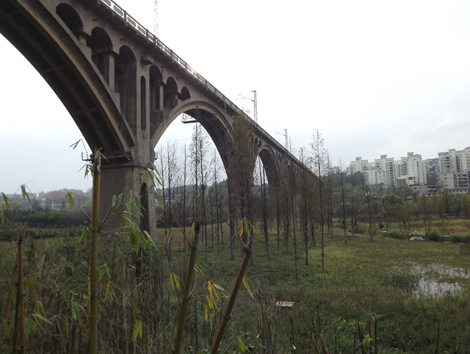 在鐵路橋至麥翁橋之間,沿花溪大道一側河岸目前已修建園路與臨水平臺,目前有一臨時管理用房,別無其他服務設施。無明顯入口接駁點,游人不便進入,且內部未形成環路。