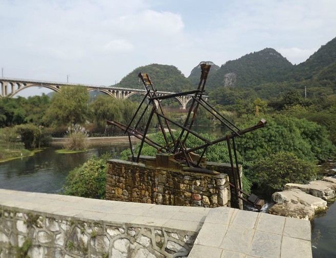 (2)上水河灘景觀:該景觀由蛇狀河曲、河牛2個小島及1個大島、水輾、小橋、上水村寨、孤丘組成。河曲竹木夾巖,綠島相間,上水村依山面水,孤丘(比高40米)屹立河畔,其襯景、對景效果好。