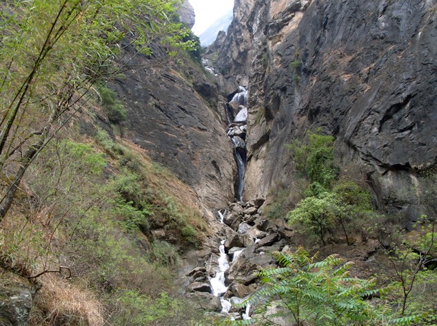 續前行,到”中虎跳“。這里喝崖排空,或直刺青天,或斜撲江口,寬闊浩蕩的江水,遇到危崖的擠壓與阻攔,似乎變得怒不可遏,它聚集力量,向崖石不斷發起沖擊,狂濤洶涌,飛瀑騰空,空谷轟鳴,聲震山谷。江底驚濤裂岸,崖頭山泉噴瀉。當你在哈巴雪山腰,沿著壁間蹬道小心攀行時,常常會遇到飛泉流瀑,從你頂上掠過,猶如進入水簾洞中。