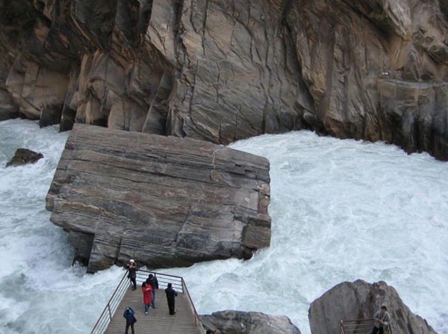 金沙江從石鼓突然急轉北流約40公里后,在中甸縣橋頭鎮闖進玉龍雪山和哈巴雪山之間,穿山削巖,劈出了一個世界上最深、最窄、最險的大峽谷——虎跳峽。虎跳峽全長17公里,上下落差200米,兩岸雪峰高出江面3000多米,其勢驚險奇絕,攝人魂魄,在虎跳峽上游的金沙江入口處,有一巨石橫臥江心,激流從僅有30米寬的巨石兩側穿流而過?濤聲震天,白浪翻滾,傳說猛虎常靠江心巨石躍上對岸,故名虎跳峽。