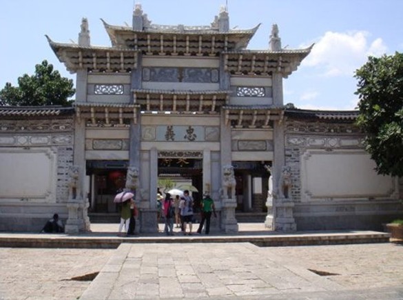 木府門前的石牌坊,用采自下虎跳金沙江邊的漢白玉建成,寬9米,高約18米,4根石柱撐著牌坊上的碑、椽、檐和坊蓋,匾額上鐫刻著明神宗欽賜的“忠義”二字。