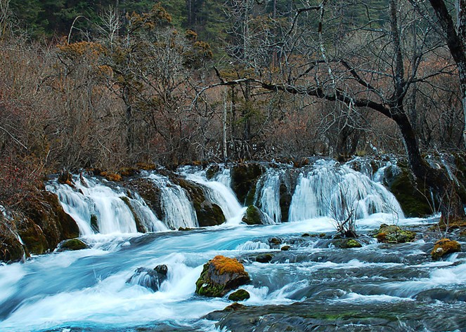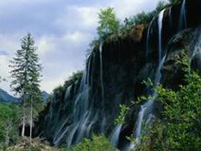 縱攬我國瀑布,或從斷崖驀然跌下,勢若大海倒瀉,銀河決口,聲勢恢宏;或從峭壁凌空飛落,狀如白綾脫軸、裊裊娜娜,姿態(tài)千般;或從洞上翻崖直下,形若水晶珠簾,垂掛洞前,妙趣橫生。而九寨溝瀑布群,則從長滿樹木的懸崖或?yàn)┥锨那牧鞒觯俨纪环殖蔁o數(shù)股細(xì)小的水流,或輕盈緩慢,或急流直瀉,千姿百態(tài),妙不可言,加上四周群山疊翠,滿目青蔥,至金秋時(shí)節(jié),層林盡染,瀑布之景就更為神奇秀麗了。
