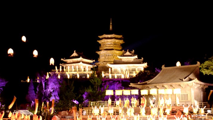 (四)世界上難度最大、飛騰最高的真人武打表演。在月黑風高的夜空,武僧騰空而起,在約80米的高空飛翔、翻滾、打斗。