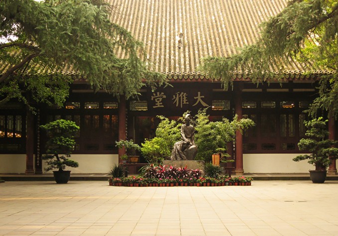 今日草堂,古樸典雅,規模宏偉,占地300多畝。其中大廨、詩史堂、工部祠3座主要紀念性建筑物,坐落在中軸線上,幽深寧靜。廨堂之間,回廊環繞,別有情趣。祠前東穿花徑,西憑水檻,祠后點綴亭、臺、池、榭,又是一番風光。園內有蔽日遮天的香楠林、傲霜迎春的梅苑、清香四溢的蘭園、茂密如云的翠竹蒼松。整座祠宇即有詩情,又富畫意,是人文景觀和自然景觀相結合的著名園林。