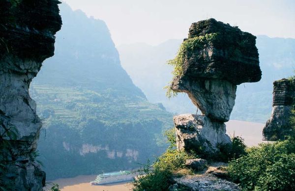 燈影石中最負(fù)盛名的是沙僧石,被譽(yù)為“萬(wàn)里長(zhǎng)江第一石”。它矗立在懸崖絕壁之巔,呈蘑菇狀,重達(dá)100余噸,底部的承重截面僅200余平方厘米,平均每平方厘米承載近半噸的重量,堪稱世界奇觀。