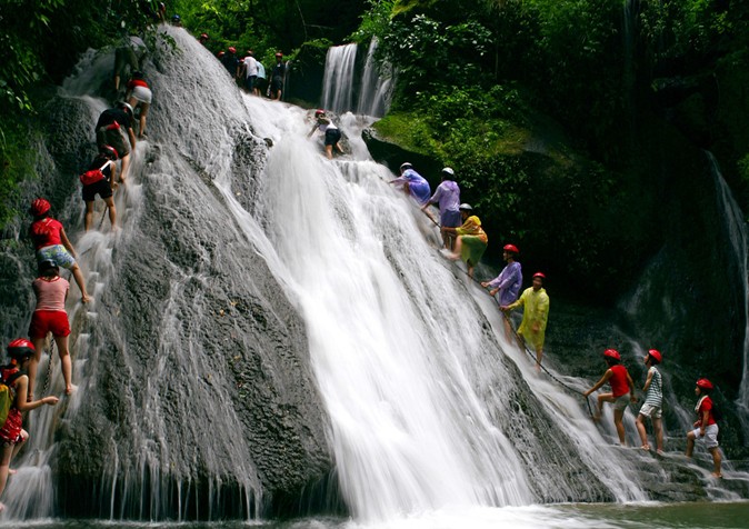 登瀑布是勇敢的活動(dòng)雖然沒有大的危險(xiǎn),但是要游客出體力,跟在別人往往是水濺一身,下水急攀登較難,雙腳輪流向上攀登,后面有人催游客,越是想往上爬,越是走不起來,手抓鐵鏈在空中搖擺著;偶爾后邊的人會(huì)幫上面的人扶一下腳,共同協(xié)作攀登困難者,也是團(tuán)結(jié)協(xié)作的團(tuán)隊(duì)精神;沿小溪而上,水有深有淺,第二道瀑布明顯比第一道要小得多,故快速而過,
