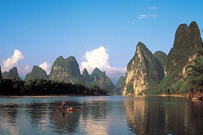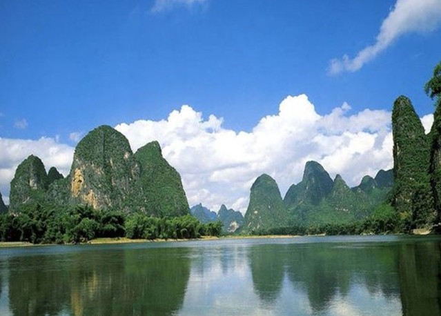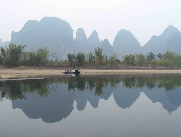 黃布倒影是漓江精華中的精華,位于漓江83公里精華段興坪古鎮境內,游船經過楊堤,過了九馬畫山,江面逐漸開闊,水平如鏡,青峰倒影,美不勝收。離畫山之南不遠,便是黃布灘。漓江山色之美,美在倒影中;漓江倒影之美,就數黃布灘倒影最為醉人。這里江流清澈,碧綠透底,從水面上可以看到江底有塊米黃色的大石板,長、寬各數丈,恰似一匹黃布平鋪在河床之上,黃布灘由此得名。