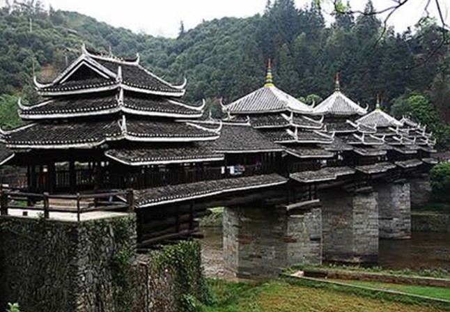 風(fēng)雨橋,也是侗族建筑藝術(shù)的一朵奇葩。在侗鄉(xiāng),縱橫交錯的溪河上都建有風(fēng)雨橋,人們根據(jù)自己的愛好和河床的寬度大小,設(shè)計出各式各樣的風(fēng)雨橋,不過在眾多的風(fēng)雨橋中,以亭樓式的風(fēng)雨橋居多,這種風(fēng)雨橋于長廊頂部豎起多個寶塔式樓閣,樓閣飛檐重疊,少的有三層,多的達(dá)五層。橋身莊重巍峨,如巨龍臥江,氣吞山河,十分壯觀。橋面兩側(cè)有精致的欄桿和舒適的座位,可供人們憩息。橋壁上或雕或畫有雄獅、蝙蝠、鳳凰、麒麟等吉祥之物圖案,形象詼諧灑脫,古香古色,栩栩如生。據(jù)傳,風(fēng)雨橋建在溪河上不僅僅是給人們交通提供便利,而且還有鎮(zhèn)邪和留財之意。