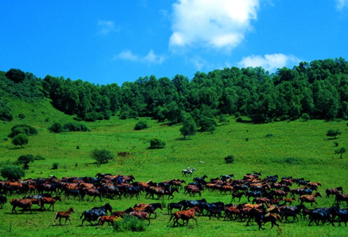 西周初年,秦人先祖非子就在汧渭之間為周王室飼牧養馬,“馬大蕃息”,功績卓著,周孝王8年(前890)被封為食邑,建城于現在隴縣牙科鄉磨兒塬。公元前776年,秦襄公遷建汧邑,位于現在隴縣東南鄉鄭家溝塬,公元前770年,襄公護送周王室東遷洛邑,有功于周平王,被正式封為諸候,汧邑成為秦國第一個都城持續到公元前762年,長達14年,秦人在隴山山地草原由畜牧業起步,完成了從游牧向農業民族的轉變過程;也正是在千河平原建立了諸候國,走向了關中平原,進而統一了全國。因此,隴山山地和千河流域是秦文化的發祥地,也是中華民族統一的漢文化形成的發源地之一。 秦統一后,隴山千河之地雖成為一普通的州縣,但仍為西北之門戶,巖疆重地,系全秦之安危,被視為“咽喉呼吸之關,鎖鑰關鍵之固”的兵家必爭之地。版權所有山東聊城聊之旅國際旅行社有限公司,轉載必究!漢王朝初期,北疆游牧民族統一于匈奴軍事帝國,占有很大軍事優勢,漢王朝被迫采取“和親”之策,以勉其掠州奪郡。漢武帝時轉為戰略反攻,終于挫敗匈奴,奠定了中國的疆域基業。漢匈之戰是中國統一多民族國家形成的重要環節,而這一過程的實現與關山草原密切相連。漢王朝軍事力量的強大,除得益于文景之治國力大增外,還憑借于作戰軍隊完成了由步兵為主向騎兵為主的轉變,大范圍機動作戰能力的形成。而當時的隴山地區,是漢王朝北擴前擁有的重要牧區,西域傳入的良馬佳駒在這里得以繁衍,滿足了軍事活動的需要。據說漢代時關山一帶牧養的馬匹達30多萬匹。霍去病20歲第一次率萬余精騎出擊匈奴,就是過關山出隴西,沿祁連山直趨西北,長途奔襲,凱旋而歸。盛唐之時,關山牧馬業更為發達,朝廷設立了隴右牧馬監,王候將相的私牧也多放養于此。中國歷史的漢唐雄風之中必然也包括源于關山草原的漢唐朝駿馬的雄姿。 《木蘭辭》 中有“關山度若飛”一句,說的就是這里的關山。