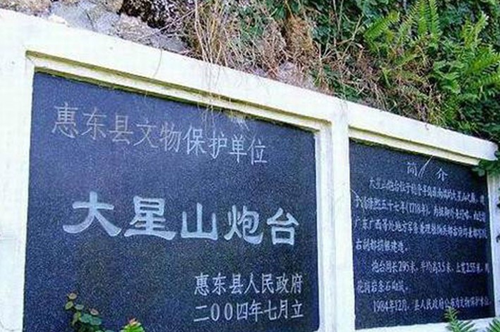 大星山炮臺位于港口鎮最南端的大星山西南面,是平海諸炮臺中保存得相當完好的炮臺。東、西、南三面臨海,地勢險要,易守難攻,是歷代兵家必爭之地。鴉片戰爭前夕,帝國主義列強不斷派兵侵略中國,為抵御外來侵略,清康熙五十六年(1718年),廣東、廣西地方軍務兼理糧餉兵部右侍郎兼都察院右副都等捐銀在此建造炮臺,筑成軍事要塞。炮臺用麻石砌筑,周長295米,平均高3.5米,寬2.55米。